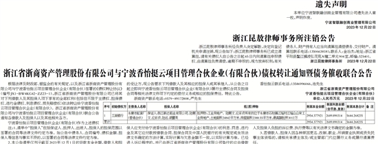 浙江省浙商资产管理股份有限公司与宁波香怡挺云项目管理合伙企业(有限合伙)债权转让通知暨债务催收联合公告