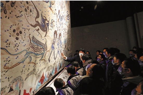 | 12月21日,讲解员在展览上向前来参观的中学生介绍莫高窟第285窟东披壁画(复制品)上的内容。 当日,上海天文馆《敦煌星空》主题展开幕。展览分为步入敦煌、壁上星辰、洞藏繁星、续说星宇四个主题展区。由敦煌研究院授权并制作的2铺莫高窟巨幅复制壁画和9件珍贵敦煌天文展品,结合上海天文馆策划的环幕多媒体秀《星河之间》,为参观者呈现敦煌的星空之美。 新华社 方喆 摄 |