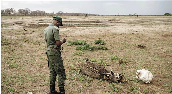 | 12月16日,一名工作人员在津巴布韦万盖国家公园收集大象尸体的GPS定位。 国际爱护动物基金会11日说,由于持续干旱,津巴布韦万盖国家公园内至少100头大象因缺水死亡。环保人士担心,受气候变化和厄尔尼诺现象影响,今后可能还会有更多大象死亡。 新华社 法新 |