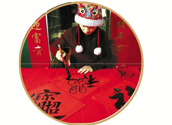 2月2日,英国伦敦一家重庆餐厅内,一名女子为顾客写福字。 新华社 李颖 摄