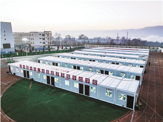 这是1月2日在青海省海东市民和回族土族自治县官亭镇中心学校拍摄的板房教室(无人机照片)。