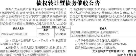 根据光大金瓯资产管理有限公司与陈报辉签订了《金融资产收益权转让合同》,光大金瓯资产管理有限公司所合法拥有的本公告项下资产(包括债权及担保从权利),已依法转让给陈报辉,光大金瓯资产管理有限公司特公告通知各债务人及担保人(或义务担保人),从公告之日起向陈报辉履行相关义务。陈报辉作为上述资产的受让人,现公告要求债务人及担保人(或义务担保人),在公告之日起向陈报辉履行主债权合同及担保合同约定的偿付义务或相应的担保责任或法院判决文书所确定的义务。