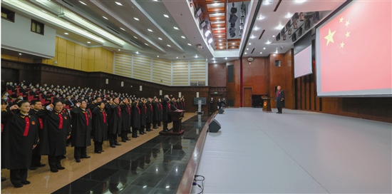 1月2日上午,浙江省高级人民法院举行宪法宣誓活动。39名新任院庭长、审委会委员、员额法官等身穿法袍庄严宣誓:“忠于中华人民共和国宪法,维护宪法权威,履行法定职责,忠于祖国、忠于人民,恪尽职守、廉洁奉公,接受人民监督,为建设富强民主文明和谐美丽的社会主义现代化强国努力奋斗!”浙江高院党组书记、院长李占国监誓,党组副书记、常务副院长张宏伟领誓。