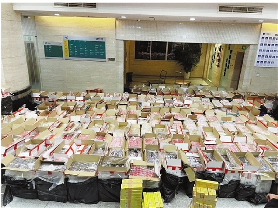 警方在现场查获作案用对讲机2台、点钞机1台、银行卡数张、作案手机4部,还查获一处存储假烟的窝点,查扣假烟9200条。