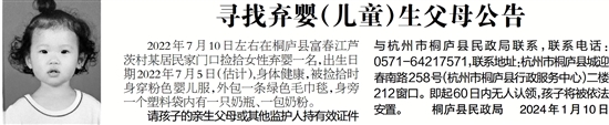 请孩子的亲生父母或其他监护人持有效证件与杭州市桐庐县民政局联系,联系电话:0571-64217571,联系地址:杭州市桐庐县城迎春南路258号(杭州市桐庐县行政服务中心)二楼212窗口。即起60日内无人认领,孩子将被依法安置。 桐庐县民政局 2024年1月10日
