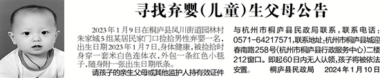 请孩子的亲生父母或其他监护人持有效证件与杭州市桐庐县民政局联系,联系电话:0571-64217571,联系地址:杭州市桐庐县城迎春南路258号(杭州市桐庐县行政服务中心)二楼212窗口。即起60日内无人认领,孩子将被依法安置。 桐庐县民政局 2024年1月10日