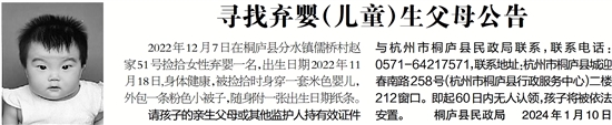 请孩子的亲生父母或其他监护人持有效证件与杭州市桐庐县民政局联系,联系电话:0571-64217571,联系地址:杭州市桐庐县城迎春南路258号(杭州市桐庐县行政服务中心)二楼212窗口。即起60日内无人认领,孩子将被依法安置。 桐庐县民政局 2024年1月10日