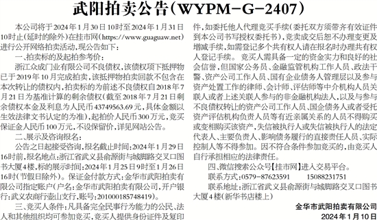 本公司将于2024年1月30日10时至2024年1月31日10时止(延时的除外)在挂市网(https://www.guaguaw.net)进行公开网络拍卖活动,现公告如下: