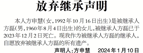 本人方申慧(女,1992年10月16日出生)是被继承人方磊(男,1960年8月4日出生)的女儿,被继承人方磊已于2023年12月2日死亡。现我作为被继承人方磊的继承人,自愿放弃被继承人方磊的所有遗产。
