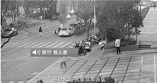 1月11日,江苏南京街头,一辆轿车突发起火,司机被困。上班经过的小伙陈竹听到求救声,冲过马路,从喷火的车内拉出了司机。将人救出后,他发现自己整个身体都在颤抖。伤者被及时送医救治。随后,消防员扑灭了明火,他们说,陈竹出手救人的几十秒非常关键。13日,陈竹获见义勇为表彰。