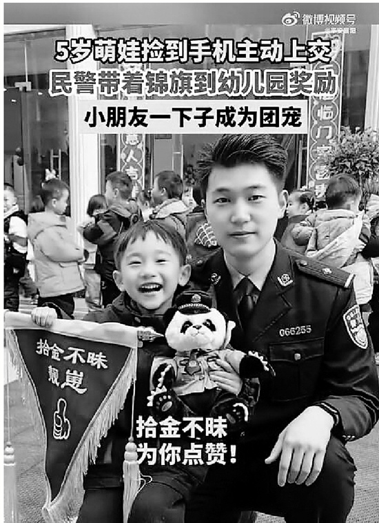 近日,湖北襄阳,一名5岁萌娃捡到一部手机,到派出所交给警察叔叔。民警带着印有“拾金不昧靓崽”的锦旗和小熊玩偶来到幼儿园,奖励小朋友。
