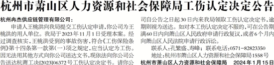 杭州市萧山区人力资源和社会保障局工伤认定决定公告