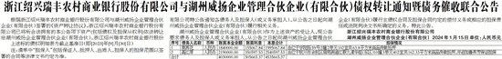 根据浙江绍兴瑞丰农村商业银行股份有限公司与湖州威扬企业管理合伙企业(有限合伙)签署的《资产转让协议》,浙江绍兴瑞丰农村商业银行股份有限公司已将所合法拥有的本公告项下资产(包括债权及担保从权利)依法转让给湖州威扬企业管理合伙企业(有限合伙),浙江绍兴瑞丰农村商业银行股份有限公司特公告通知各债务人及担保人(或义务承担人),从公告之日起向湖州威扬企业管理合伙企业(有限合伙)履行相关义务。