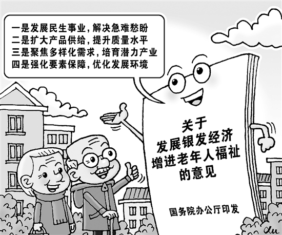 | 近日,国务院办公厅印发《关于发展银发经济增进老年人福祉的意见》。 银发经济是向老年人提供产品或服务,以及为老龄阶段做准备等一系列经济活动的总和,涉及面广、产业链长、业态多元、潜力巨大。为积极应对人口老龄化,促进事业产业协同,加快银发经济规模化、标准化、集群化、品牌化发展,培育高精尖产品和高品质服务模式,让老年人共享发展成果、安享幸福晚年,《意见》提出了4个方面26项举措。 新华社 徐骏 作 |