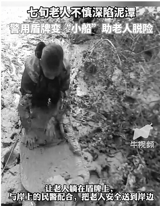 近日,江西赣州市大余县一名七旬老人在抽干的池塘里捡螺蛳时,不慎深陷泥潭。民警接警后立刻赶往现场,用树枝铺路,走到老人身边,将其腿部周围的淤泥清理干净,让老人躺在盾牌上,与岸上的民警配合,把老人安全送到岸边。