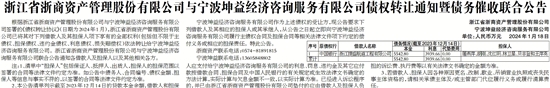 根据浙江省浙商资产管理股份有限公司与宁波坤益经济咨询服务有限公司签署的《债权转让协议》(日期为2024年1月),浙江省浙商资产管理股份有限公司已将其对下列借款人及其担保人项下享有的全部权利(包括但不限于主债权、担保债权、违约金债权、利息债权、损失赔偿权)依法转让给宁波坤益经济咨询服务有限公司。浙江省浙商资产管理股份有限公司与宁波坤益经济咨询服务有限公司联合公告通知各借款人及担保人以及其他相关各方。