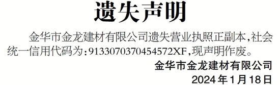 金华市金龙建材有限公司遗失营业执照正副本,社会统一信用代码为:9133070370454572XF,现声明作废。