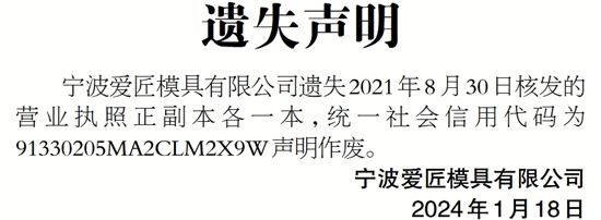 宁波爱匠模具有限公司遗失2021年8月30日核发的营业执照正副本各一本,统一社会信用代码为91330205MA2CLM2X9W声明作废。