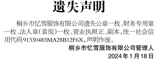 桐乡市忆雪服饰有限公司遗失公章一枚、财务专用章一枚、法人章(袁侃)一枚、营业执照正、副本,统一社会信用代码91330483MA28B12F6X,声明作废。