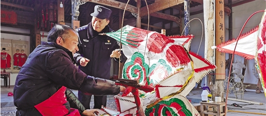1月17日,东阳市公安局南市派出所民警走访乡村,一边了解社情民意,一边宣讲反诈等安全知识。图为民警与正在制作龙灯的师傅拉家常。