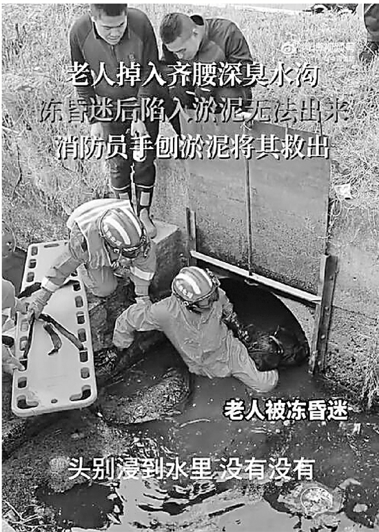 近日,湖北黄冈,一名老人不慎掉进一臭水沟中,由于天气寒冷,老人在水里被冻昏迷,身体深深陷入淤泥里。消防员接警后火速赶赴,一脚踩进齐腰深的水沟中,探进水底徒手刨挖淤泥。空气中弥漫着水被搅动后散发的恶臭,救援人员丝毫不觉,小心救出老人后紧急送医。所幸救援及时,老人并无大碍。
