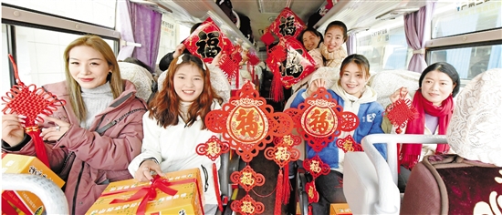 图为1月28日,一家企业的甘肃籍员工在返乡过年专车上展示福字和慰问品。