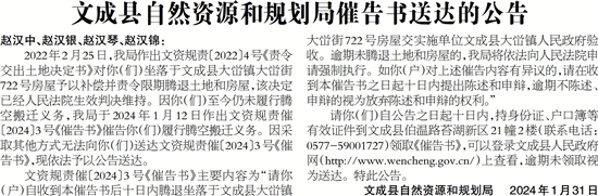 2022年2月25日,我局作出文资规责〔2022〕4号《责令交出土地决定书》对你(们)坐落于文成县大峃镇大峃街722号房屋予以补偿并责令限期腾退土地和房屋,该决定已经人民法院生效判决维持。因你(们)至今仍未履行腾空搬迁义务,我局于2024年1月12日作出文资规责催〔2024〕3号《催告书》催告你(们)履行腾空搬迁义务。因采取其他方式无法向你(们)送达文资规责催〔2024〕3号《催告书》,现依法予以公告送达。