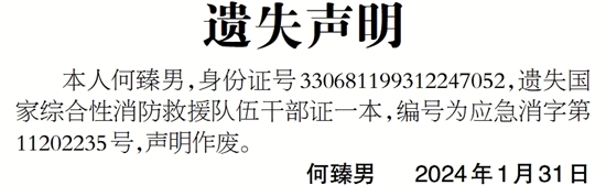 本人何臻男,身份证号330681199312247052,遗失国家综合性消防救援队伍干部证一本,编号为应急消字第11202235号,声明作废。