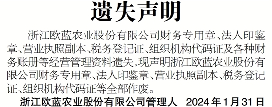 浙江欧蓝农业股份有限公司财务专用章、法人印鉴章、营业执照副本、税务登记证、组织机构代码证及各种财务账册等经营管理资料遗失,现声明浙江欧蓝农业股份有限公司财务专用章、法人印鉴章、营业执照副本、税务登记证、组织机构代码证等全部作废。