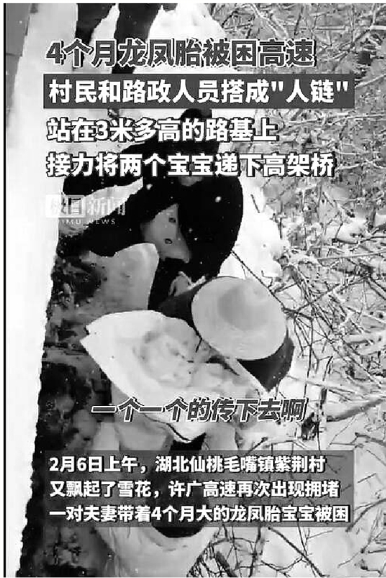 2月6日上午,湖北仙桃毛嘴镇紫荆村又飘起了雪花,许广高速再次出现拥堵,紫荆村党支部书记张先爽率近200名村民给滞留旅客送泡面、开水,帮忙铲雪。一对夫妻带着4个月大的龙凤胎宝宝被困,现场村民和路政人员10余人搭成“人链”,将两个宝宝从落差3米多高的高速公路上递下,并驾车将母子三人送至仙桃西站让他们转乘动车。“那么小的宝宝,他们能平安到达目的地,我们就放心了。”张先爽说。