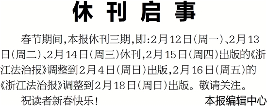 春节期间,本报休刊三期,即:2月12日(周一)、2月13日(周二)、2月14日(周三)休刊,2月15日(周四)出版的《浙江法治报》调整到2月4日(周日)出版,2月16日(周五)的《浙江法治报》调整到2月18日(周日)出版。敬请关注。
