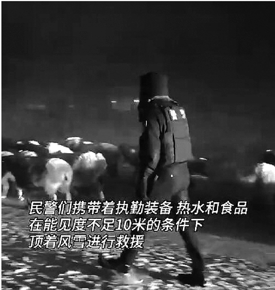 | 民警风雪中帮牧民转移牲畜1000余只 @人民日报 (《人民日报》法人微博) 2月16日晚,新疆伊犁夏特边境派出所接报警求助称,山区有八户牧民转场途中遭遇暴风雪被困,民警立即出警赶往现场,携带着执勤装备、热水和食品,在能见度不足10米的条件下,顶着风雪进行救援,经过三个小时近7公里的跋涉,成功将牧民和1000余只牲畜,平安护送至牧民定居点。 |