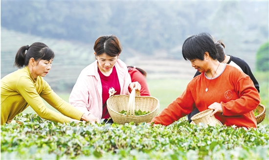 2月19日是雨水节气,广西兴业县山心镇蓬塘村茶农紧抓农时,采制春茶。近年来,兴业县大力发展茶产业,全县茶园面积2万多亩,年产值约1.8亿元。 新华社 曹祎铭 摄
