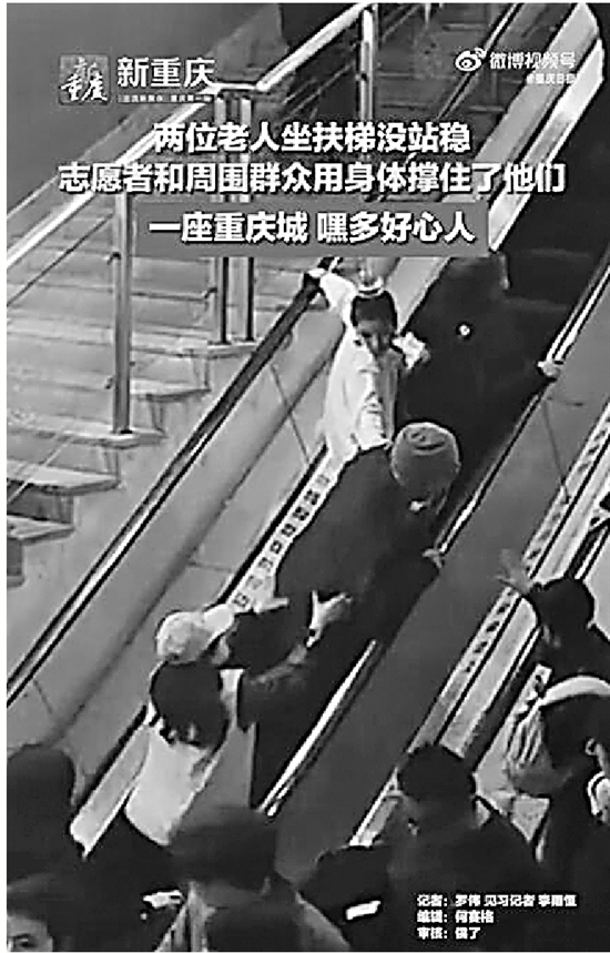 | 两老人乘扶梯没站稳 周围群众合力撑住 @人民日报 (《人民日报》法人微博) 近日,重庆渝中区两位老人乘坐扶梯没站稳,志愿者和周围群众用身体撑住了他们。“当时什么都没有想,看到老人即将摔倒,第一时间就冲了上去。我相信即使是其他热心民众看到,也会像我一样,第一时间冲上去。” |