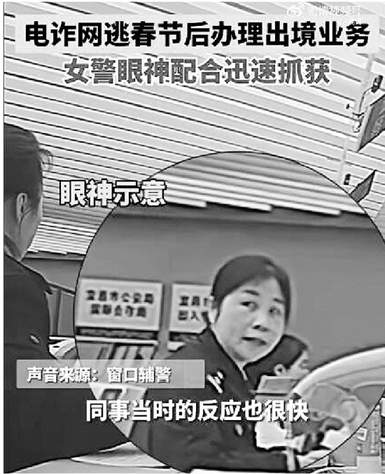 近日,湖北宜昌,出入境窗口女警工作时,警报系统弹出提示,显示办理业务的人员为网上逃犯。女警立即向附近同事眼神示意,同事默契配合,核查确认后果断将逃犯抓获。