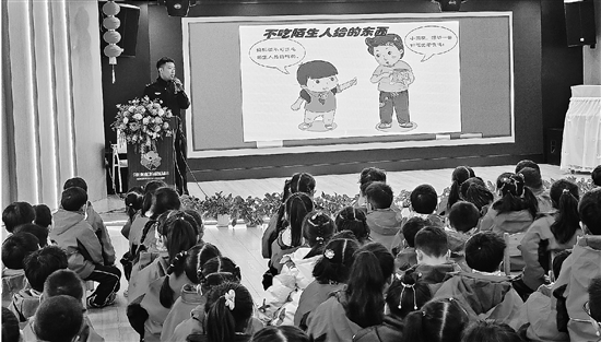 2月26日,温州龙湾公安海滨派出所民警来到龙湾区第七幼儿园,给孩子们上了以“防拐骗”为主题的“开学第一课”。民警针对孩子们的年龄特点,用简明直观、浅显易懂的方式讲解防走失、防拐骗等安全知识,用鲜活的事件案例让孩子们将安全知识记在心间。
