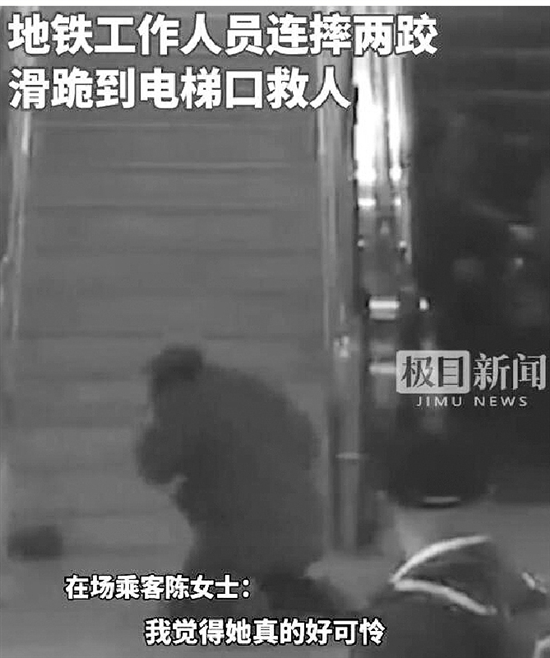 近日,湖北武汉地铁4号线列车到达终点站武汉火车站,地铁站的手扶电梯上,一名女乘客失去重心摔倒,附近地铁工作人员祝琼晶见状飞奔冲上前,途中两次不慎摔倒,直至跪地爬过去按下紧急停梯按钮,整个过程用时仅5秒钟,避免了更大危险的发生。