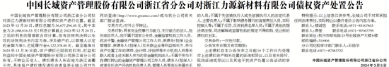 中国长城资产管理股份有限公司浙江省分公司对浙江力源新材料有限公司债权资产处置公告