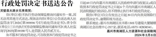 你(单位)拒不执行劳动保障监察询问通知书一案,因无法用其他方式送达,现依法向你(单位)公告送达南人社监罚决字〔2024〕第000006号《行政处罚决定书》:责令你(单位)三日内执行《劳动保障监察询问通知书》(南人社监询字[2023]第00180号),处罚款人民币贰万元。