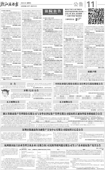 郑雄、朱春月:本院受理原告郑渭泉诉被告郑雄、朱春月民间借贷纠纷一案已审理终结,现依法向你们送达(2024)浙0106民初57号民事判决书,自公告之日起30日内来本院领取民事判决书,逾期则视为送达。如不服本判决,可在公告期满后15日内,向本院递交上诉状及副本,上诉于浙江省杭州市中级人民法院。逾期未上诉的,本判决即发生法律效力。 杭州市西湖区人民法院