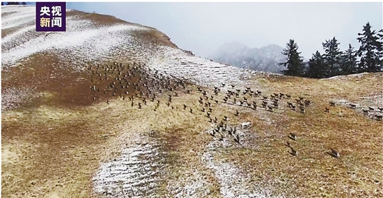 近日,甘肃祁连山国家级自然保护区寺大隆自然保护站管护人员利用无人机巡护时,拍摄到一大群岩羊在雪地觅食、追逐,据管护人员目测达200多只。