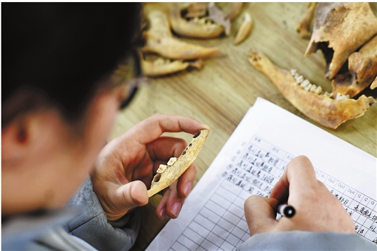 | 队员王红英在动物骨骼实验室登记考古出土的动物骨骼信息 |