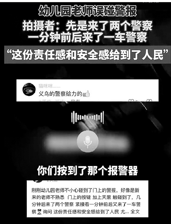 近日,浙江义乌。幼儿园老师误触警报,警察几分钟内赶到。据拍摄者:警察先打了电话没人接,马上就来了两个警察,一分钟后来了一车警察。网友:这份责任感和安全感给到了人民。