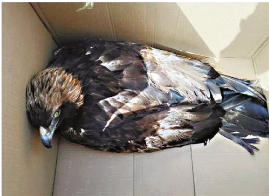 接警后,民警立即赶赴现场,经仔细查看眼前的野生动物头顶呈黑褐色,后头至后颈羽毛尖长,呈柳叶状,羽基暗赤褐色,羽端金黄色,背肩部微紫色光泽,身体并无明显外伤,初步判断其为国家一级保护动物金雕。随后,民警小心翼翼将金雕放在纸箱内,送往陕西省珍稀野生动物抢救饲养中心。