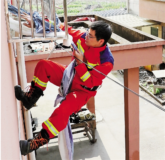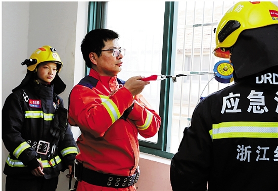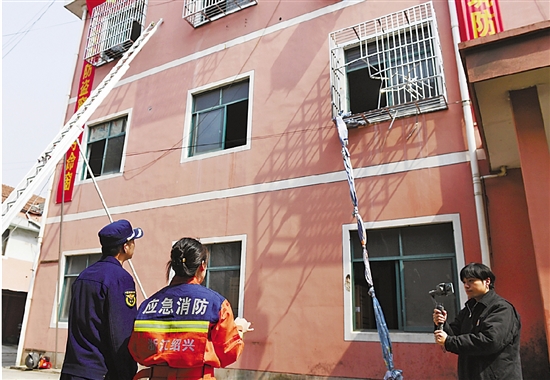 简单休整后,记者来到三楼,体验通过防盗窗逃生口逃生。考虑到记者的安全问题,此次模拟利用了缓降器。