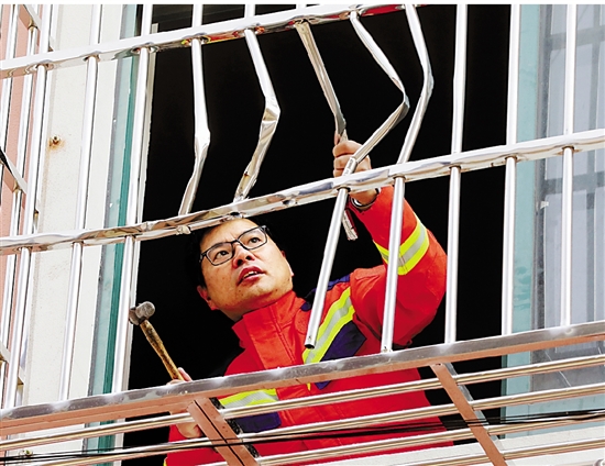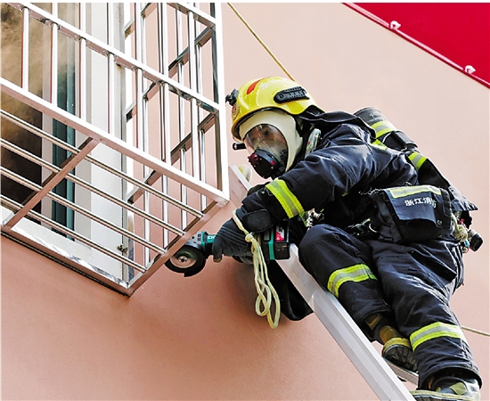 做好安全防护后,消防员通过拉梯爬至防盗窗外侧,然后用角磨机从下往上对防盗窗进行破拆。