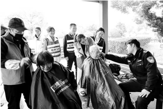 近日,临海市公安局杜桥派出所携手当地志愿者,免费为环卫工人提供理发服务,营造了社会各界关爱环卫工人、尊重环卫成果的良好氛围。 通讯员 叶明銮 摄
