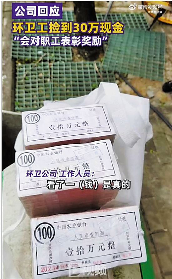 3月18日,海南海口,女环卫工梁爱珠上午约9点50分,在椰海大道附近一垃圾箱中,发现三捆包装完好的百元钞票,每捆都有标注“拾万元整”的字样。环卫公司工作人员表示,目前捡到的现金已交给警方,后续会对该职工表彰奖励。