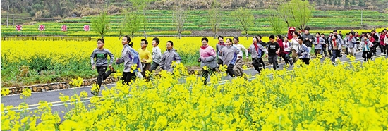 3月18日,仙居县双庙乡中心小学的学生奔跑在金色的油菜花海中。当日,该校在双庙乡油菜花田绿道上举行迷你马拉松运动,让孩子们在春光花海中感受户外运动的快乐。 王华斌 摄