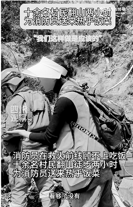 3月19日,四川甘孜。200余名消防员徒步赶赴扑火点,开展灭火救援。消防员在救火前线顾不上吃饭,十余名村民翻山徒步两个小时,为消防员送来热乎饭菜,回锅肉、大馒头,真香!